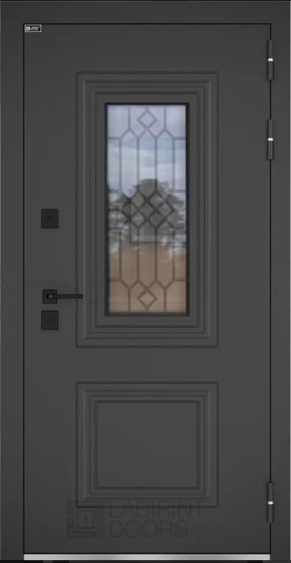 4-х камерный стеклопакет 81 мм, снаружи тонированное стекло графит, внутри зеркальное серебро. Лазерная решетка внутри стеклопакета (муар черный)