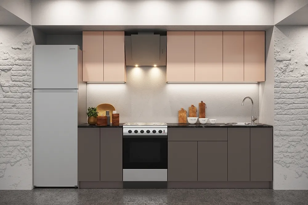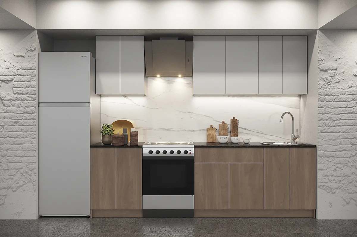 Представляем вашему вниманию изысканное решение для вашей кухни — кухонный гарнитур Белль прямая GKK1024 из коллекции "Белль". Этот гарнитур идеально впишется в любой интерьер благодаря своему прямому расположению и элегантному дизайну. Размеры гарнитура составляют 2150x2000x600 мм, что позволяет эффективно использовать пространство вашей кухни. Белый каркас, выполненный из ЛДСП, создает светлую и легкую атмосферу. Фасады, доступные в цветовых сочетаниях "Роза, Графит", "Обриета, Торроне", "Спумони, Графит", изготовлены из высококачественного МДФ и покрыты пленкой ПВХ, придающей поверхностям дополнительную износостойкость и элегантный вид.